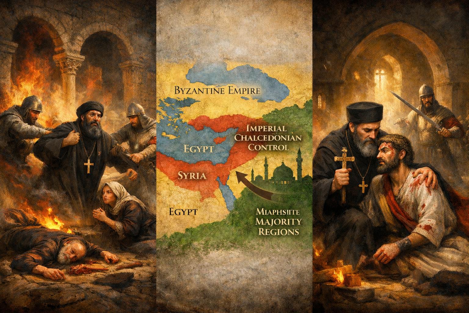 From the council chamber of Chalcedon to the deserts and cities of Egypt and Syria, the period beginning in 451 AD witnessed the tragic spectacle of Chalcedonians persecuting fellow Christians over doctrinal differences – persecution which would resurface again, centuries later, when Chalcedonian/Latin Crusaders treated Coptic Miaphysites as heretics rather than allies. The Miaphysite Orthodox—the Copts of Egypt, together with the Syriac Orthodox and Armenian Apostolic Churches – chose to endure exile, intimidation, and bloodshed rather than compromise their theological convictions. Imperial Byzantine policy, motivated by a desire for religious unity, became “systematic, brutal, and relentless” in its repression of Miaphysitism. By the eve of the Arab conquests, this policy had only succeeded in alienating large segments of the empire’s population.